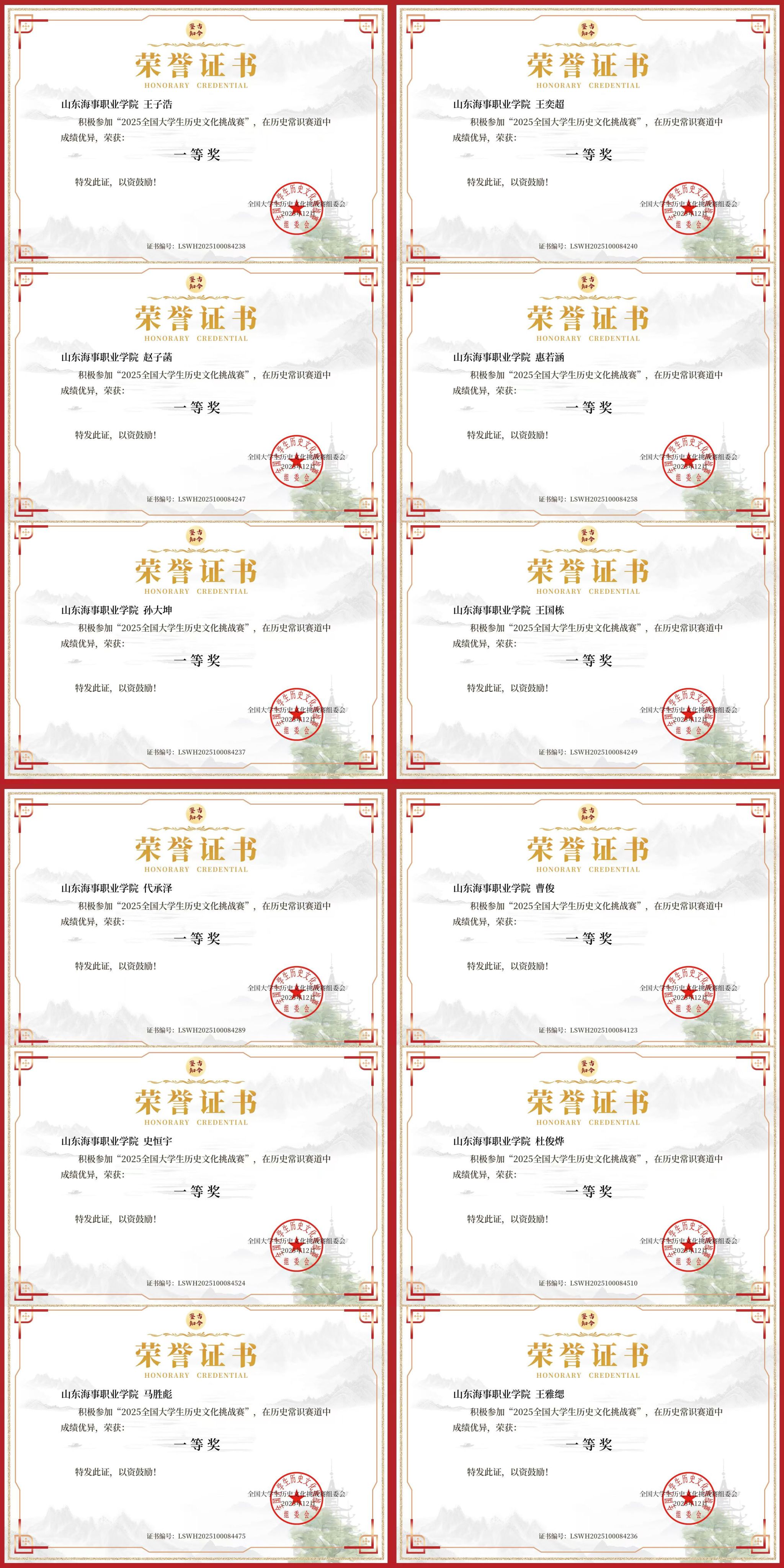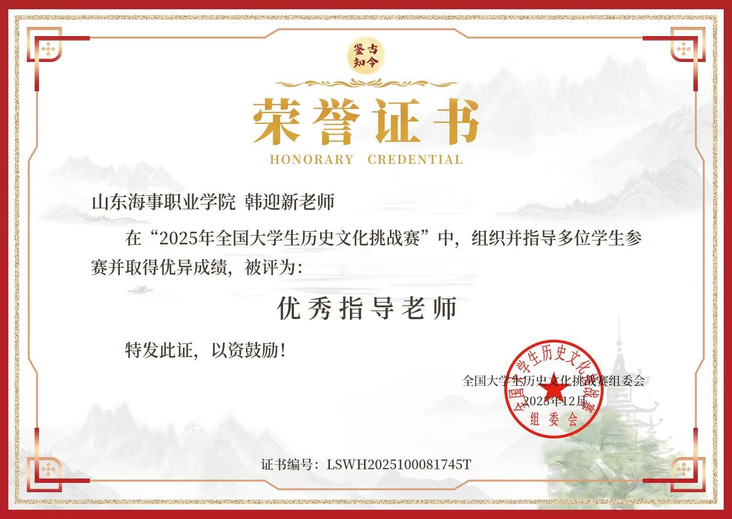 近日,在2025年全国大学生历史文化挑战赛中,我院学子表现优异,王子浩、王奕超、赵子菡等多位学生斩获一等奖。同时,我院获评“优秀组织单位”,韩迎新等多位教师荣获“优秀指导老师”称号。