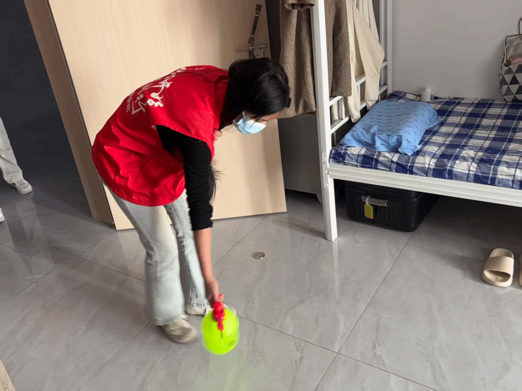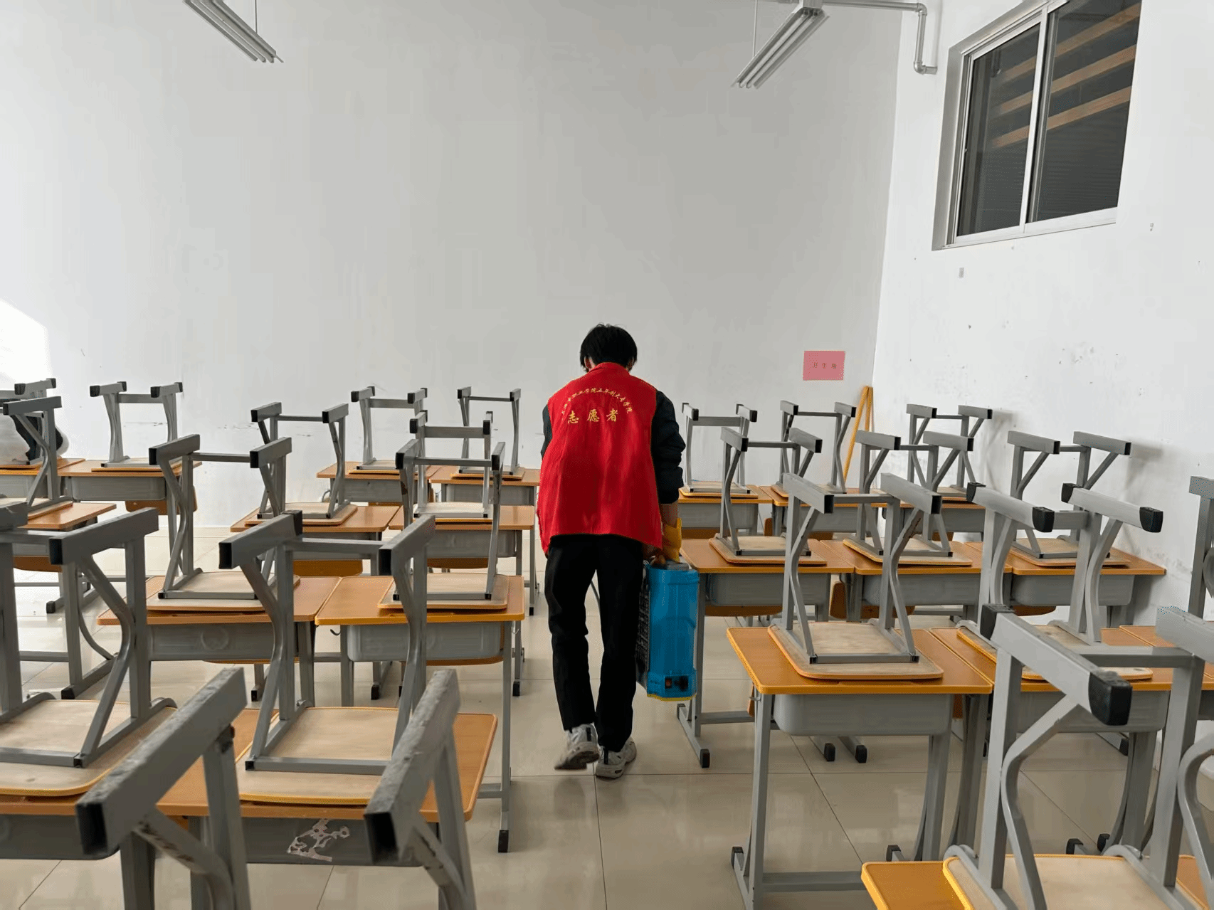 活动当天,志愿者们携带专业消毒工具,分组对宿舍门把手、衣柜拉手、书桌等高频接触部位进行重点喷洒和擦拭;在教室区域,则对讲台、课桌椅、门窗把手等关键点位进行深度清洁消毒,并同步开窗通风,确保全方位阻断病菌传播途径。