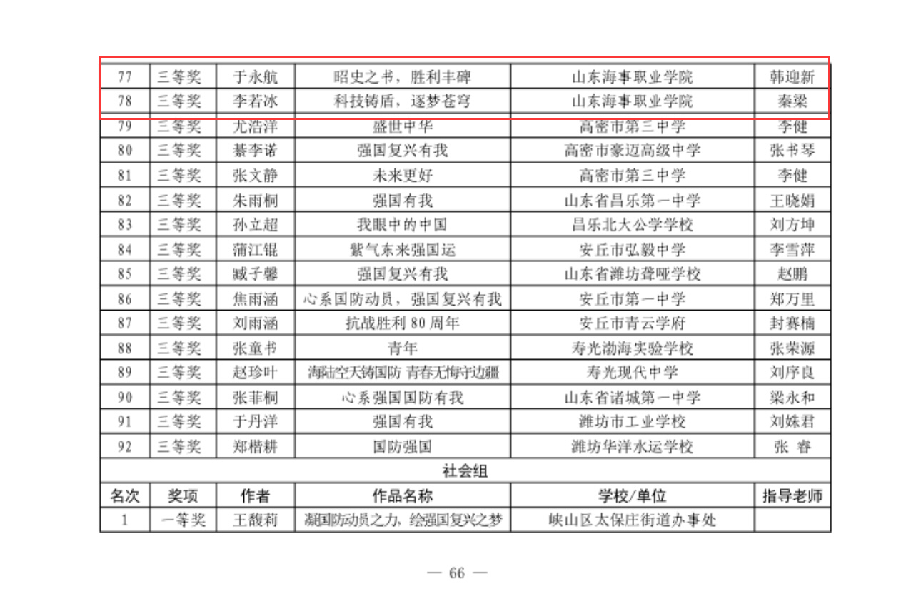 近日,潍坊市第二届“心系国防动员·强国复兴有我”主题征文绘画竞赛获奖名单正式公布,我院学生于永航、李若冰凭借出色的作品表现,双双斩获三等奖。同时,学校凭借扎实的组织成效,被授予“优秀组织奖”。
