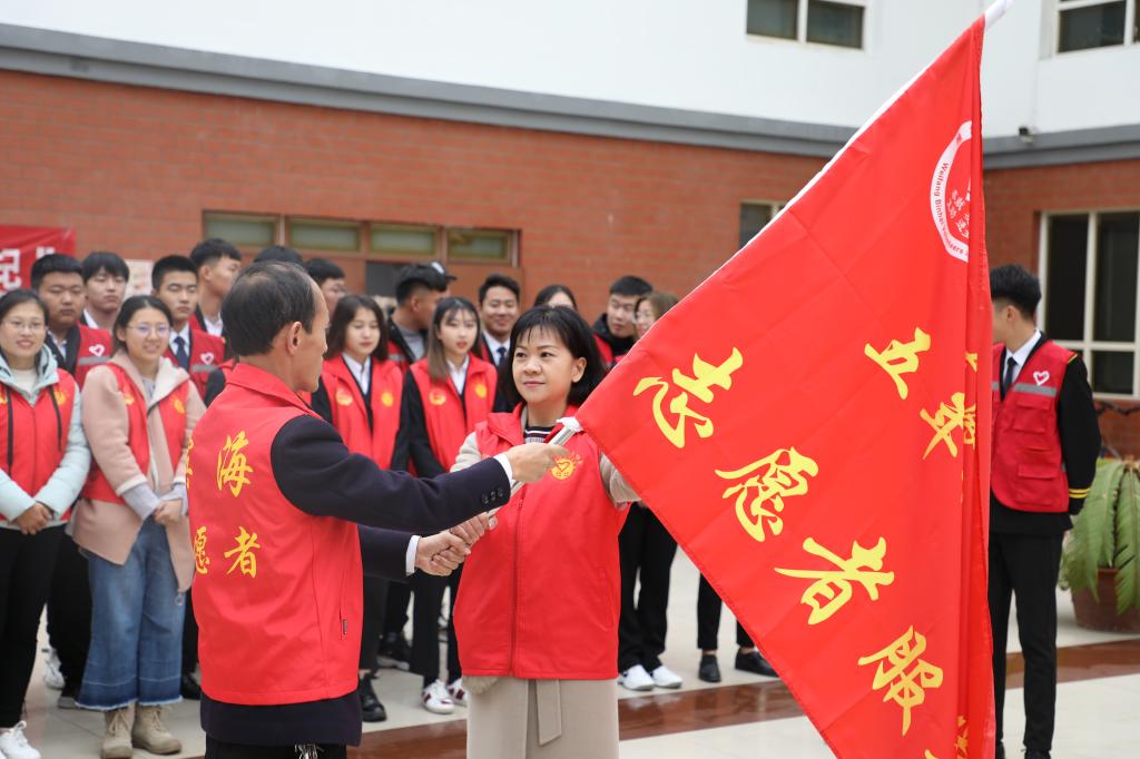 仪式上,潍坊滨海经济开发区社会组织发展中心孙炳海主任为五年制大专学院授予了“志愿者服务大队”旗帜。田兴红老师在授旗仪式上宣读了志愿服务的职责和义务,并希望各位志愿者在今后的公益活动践行中积极发挥作用,不断倡导文明新风尚,为推动志愿服务的发展贡献力量。随后,伴随着《青年志愿者之歌》的温暖旋律,全体大学生志愿者高举右拳,面向服务大队队旗进行了庄严的宣誓。