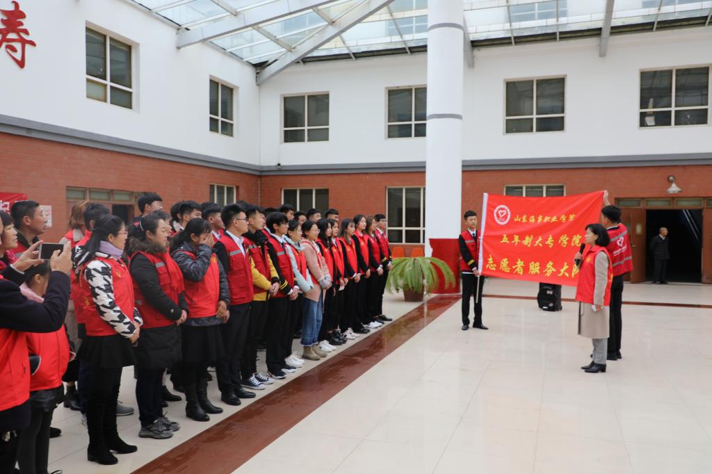 为进一步弘扬“奉献、友爱、互助、进步”的志愿者精神,推动山东海事职业学院五年制大专学院青年志愿服务工作常态化、规范化,不断增强学院志愿者行动的感召力和凝聚力。山东海事职业学院五年制大专学院于11月24日上午,在大家洼常青园敬老院举行“志愿者服务大队”授旗仪式,全体辅导员老师、入党积极分子、学生干部、滨海经济开发区志愿者协会会员共计40余人参加了此次活动。