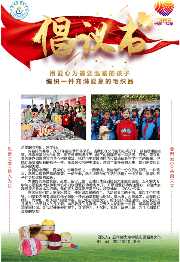 【来源:编织梦想 温暖童心--五年制大专学院“恒爱行动”爱心编织温暖启动 | 发布日期:2021-10-11 】