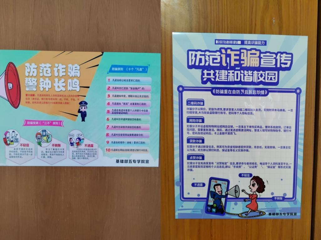 近日,为了让同学们进一步了解电信网络诈骗,对电信网络诈骗引起重视,增强我院学生对电信网络诈骗的防范意识。基础部、五年制大专学院开展了一系列防诈骗主题教育活动。