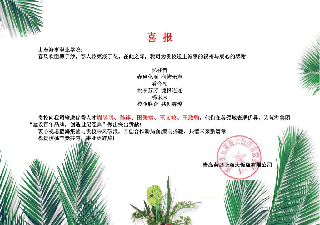 近日,青岛黄岛蓝海大饭店有限公司发来喜报。我院2021级五贯3班的周昱丞、孙祥、田秉宸、王文姣、王政翰5名实习生在实习期间,努力适应新环境、工作态度认真、积极进取、在各自领域表现优异,赢得领导、同事一致好评,以扎实的理论基础和严谨、勤奋、认真的工作作风,从公司实习生中脱颖而出,成为其他实习生的榜样。
