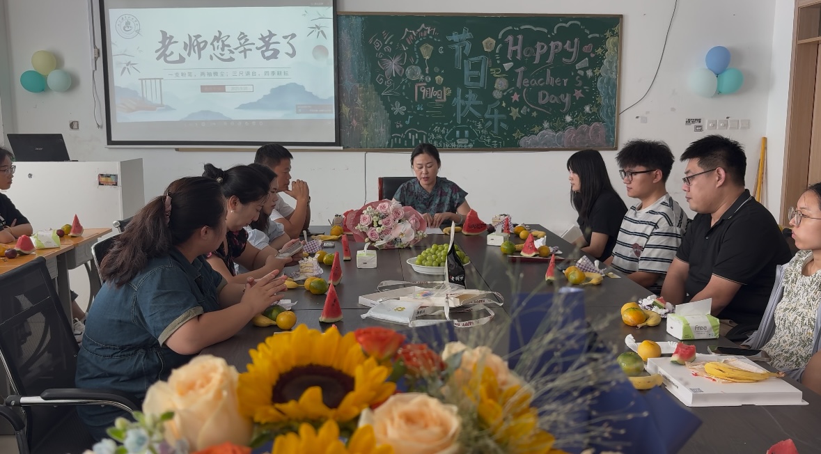 学院精心策划了一场心意满满的庆祝活动,为辛勤耕耘的老师们送上了特别的惊喜。专属定制的精美蛋糕成为现场的亮点,它不仅代表了学院对老师们深深的祝福,更在每一次切分中传递出喜悦,在每一口品尝中融化成关怀。随后的“学生祝福视频”将活动推向高潮,收获的不仅是意外之喜,更是被学生放在心上的那份温暖。随后,王春艳院长致辞,代表学院向辛勤工作的全体教师致以节日的诚挚问候,并充分肯定了大家的教学贡献,希望教师们不忘育人初心,再创佳绩。活动尾声,全体教师合影留念,定格下这份尊师重道的美好瞬间。